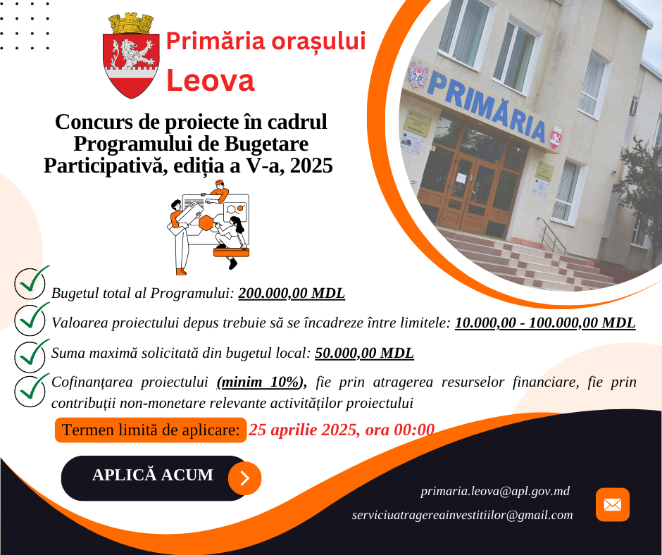 Aplicarea proiectelor în cadrul Programului de Bugetare Participativă, or. Leova, ediția 2023, s-a desfășurat în perioada 30 martie-28 iunie 2023. Grupul de lucru, întru evaluarea și validarea proiectelor, a validat două proiecte, care au obținut finanțarea de până la 50.000,00 MDL din partea administrației publice locale, conform Procesului verbal nr.1 din data de 24 iulie 2023.